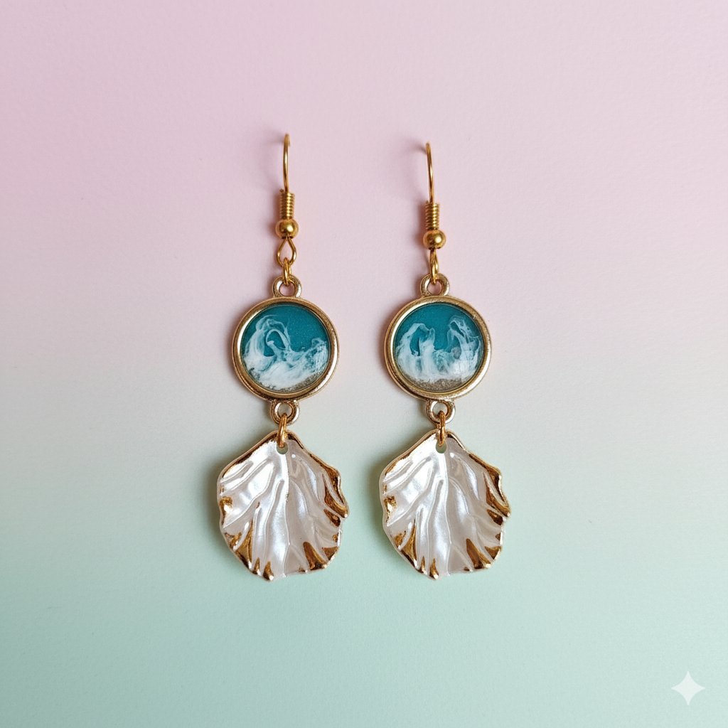 Micro Paisaje Marino: El medallón superior circular, hecho con resina epoxi de la mejor calidad y enmarcado en metal dorado, recrea las olas rompiendo con tonos turquesa vibrante y blanco espumoso.