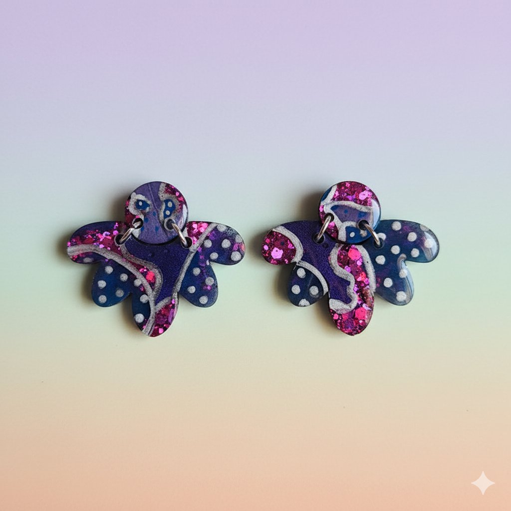 ¡Una pieza de arte funky que rompe esquemas! Los pendientes colgantes "Adela" fusionan una silueta de muñeco de jengibre con un diseño galáctico lleno de morados intensos y brillo. Son el accesorio ideal para quienes aman lo único y lo dramático.