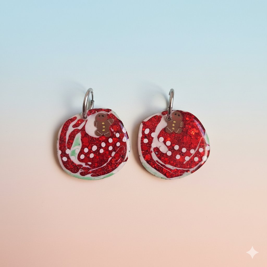 Estos encantadores pendientes circulares son pequeñas obras de arte, hechas a mano con resina epoxi de la mejor calidad para un acabado liso y un brillo espectacular. El diseño presenta un vibrante glitter rojo, detalles que simulan glaseado blanco y verde menta, y la figura de un tierno hombre de jengibre que te robará una sonrisa.