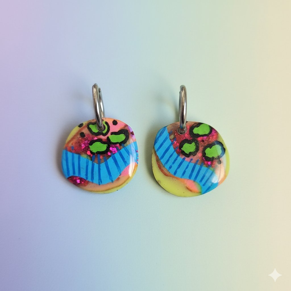 Estos pendientes redondos con forma orgánica están elaborados a mano con resina epoxi de la mejor calidad, lo que garantiza un acabado ultra-brillante y duradero. El diseño es una mezcla audaz de: