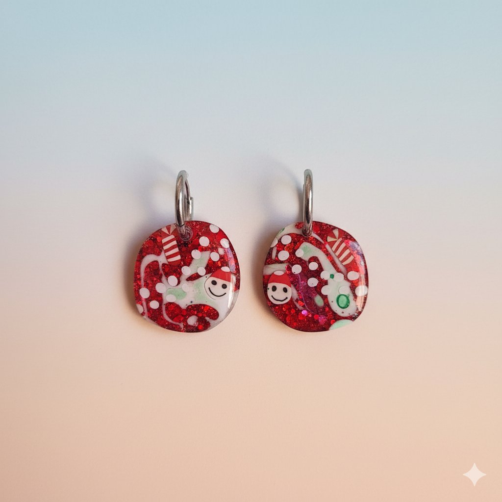 Estos adorables pendientes circulares son pequeñas joyas hechas a mano con resina epoxi de la mejor calidad, garantizando un acabado ultra-brillante y duradero. El diseño captura el espíritu navideño con un glitter rojo intenso y detalles en verde menta y blanco, destacando un simpático personaje con gorro de Papá Noel.