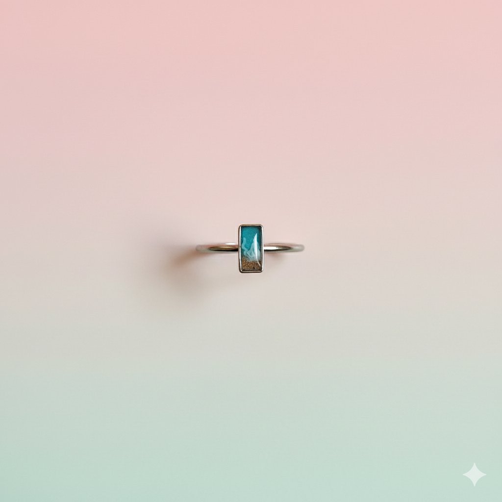 ¡Minimalismo y mar en perfecta armonía! Este anillo combina una forma geométrica moderna (barra o rectángulo) con un diminuto paisaje de la costa balear. Es una joya única y artesanal, perfecta para el uso diario o para combinar con otras piezas.