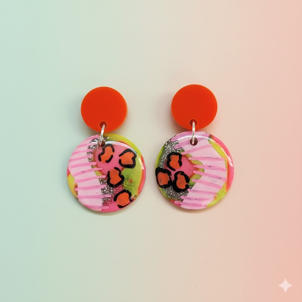 Estos pendientes redondos están elaborados a mano con resina epoxi de la mejor calidad para un acabado liso, brillante y de alta durabilidad. La paleta de colores incluye rosa chicle, amarillo neón y negro, enriquecida con glitter plateado que captura la luz con un efecto espectacular.