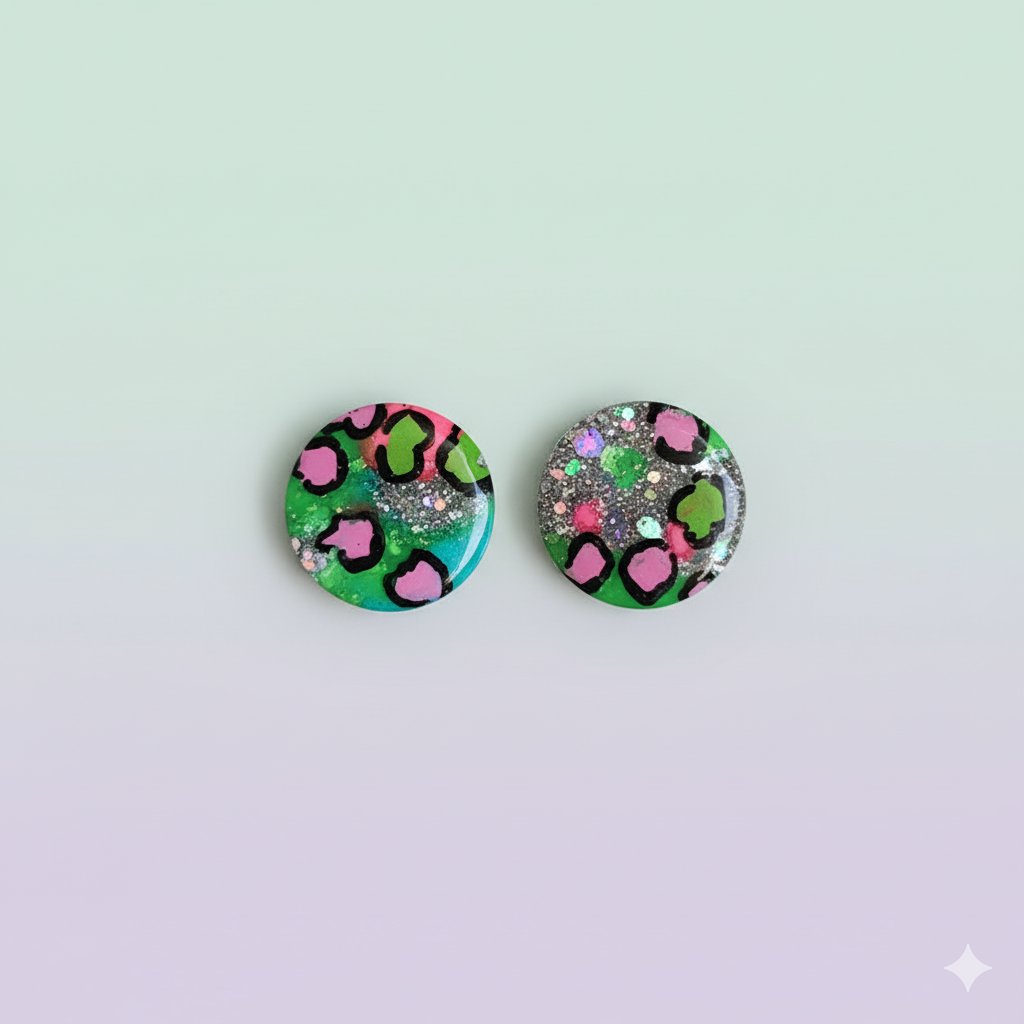 ¡Libera tu lado más audaz y divertido con los pendientes de botón "Catalina"! Este diseño rompe las reglas, fusionando el clásico animal print de leopardo con una paleta de colores neón vibrante y mucho glitter.