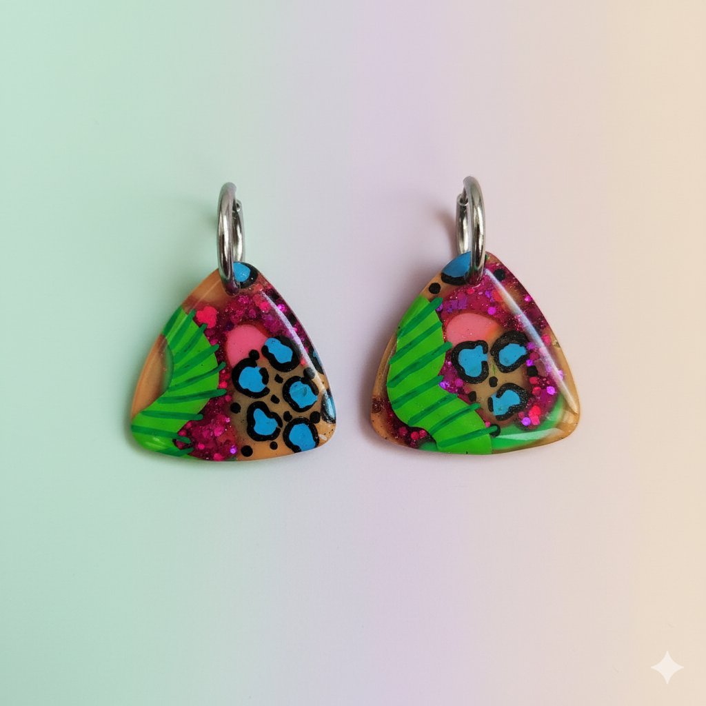 Estos pendientes triangulares están elaborados a mano con resina epoxi de la mejor calidad, garantizando un acabado brillante y liso que perdurará. El diseño combina de forma atrevida: