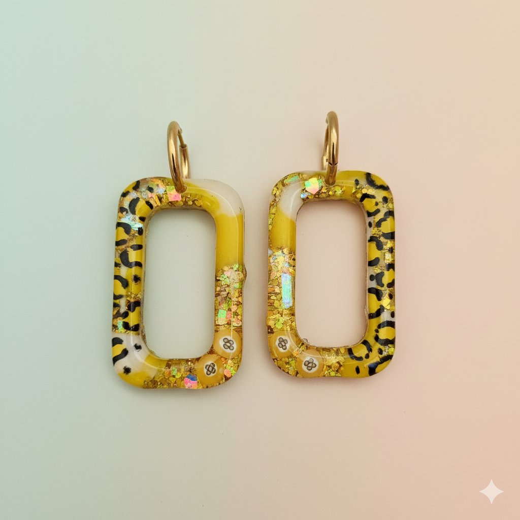 Estos pendientes rectangulares huecos están elaborados a mano con resina epoxi de la mejor calidad, garantizando un acabado ultra-brillante y liso. El diseño incluye: