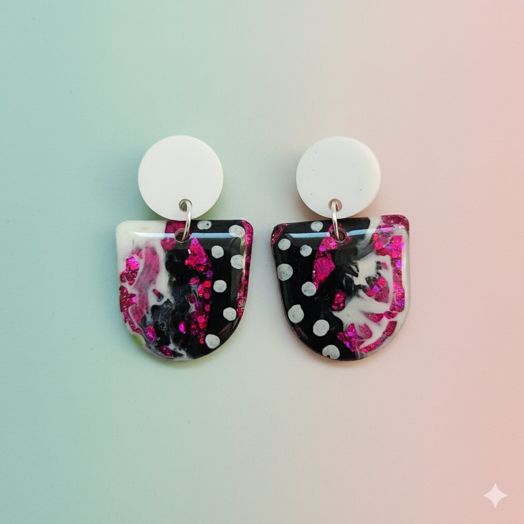 Estos pendientes en forma de arco están elaborados a mano con resina epoxi de la mejor calidad, lo que garantiza un acabado liso, ultra-brillante y duradero. El diseño incluye:
