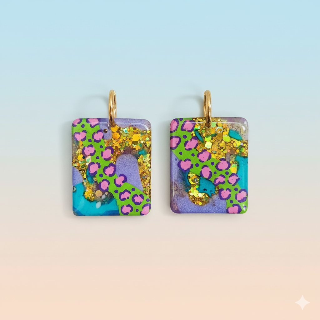 Estos pendientes cuadrados están elaborados a mano con resina epoxi de la mejor calidad, garantizando un acabado ultra-brillante, liso y duradero. El diseño es una mezcla audaz de: