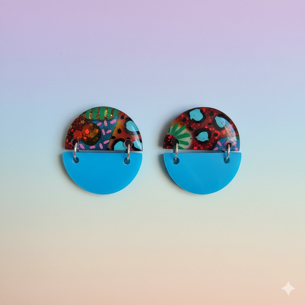 ¡Sube el volumen a tu estilo! Los pendientes colgantes "Gemma" son una explosión de color y contrastes. Fusionan un estampado funky en la parte superior con un sólido tono azul eléctrico en la parte inferior, creando un accesorio moderno y llamativo.