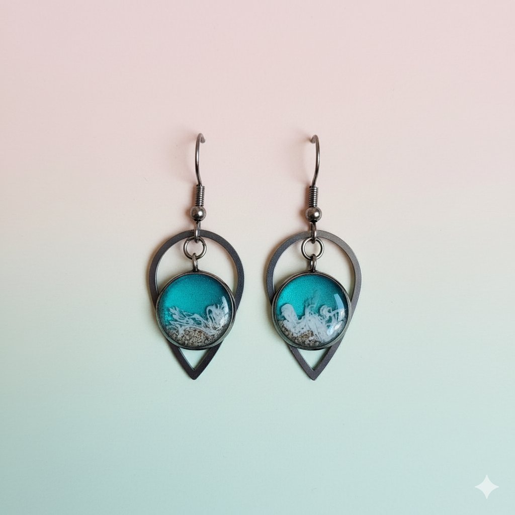 ¡Fusión perfecta de diseño minimalista y el arte de la naturaleza! Estos exquisitos pendientes colgantes capturan un vibrante paisaje costero dentro de un marco geométrico. Son una pieza de joyería única y artesanal, ideal para quienes aman el estilo moderno y el mar Mediterráneo.