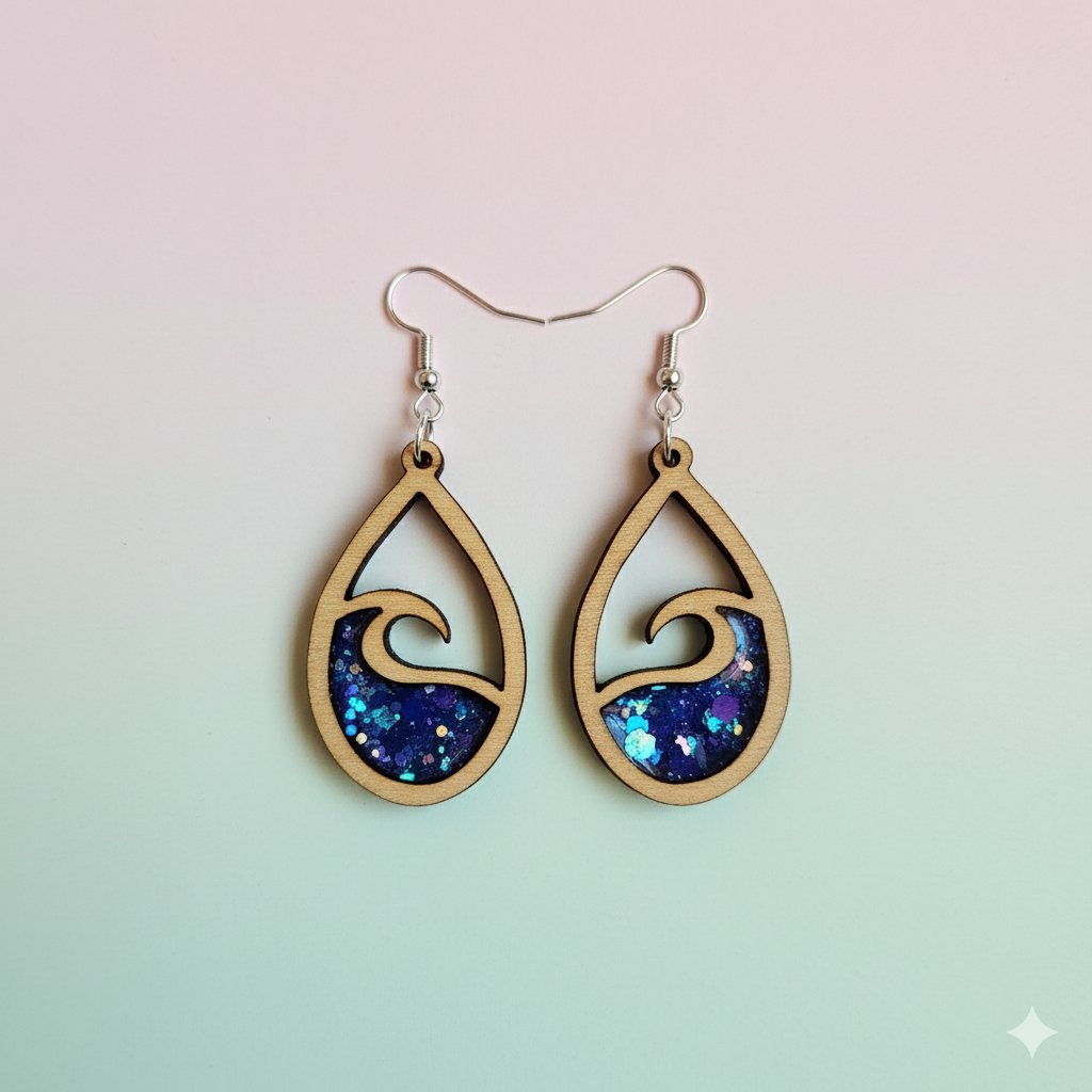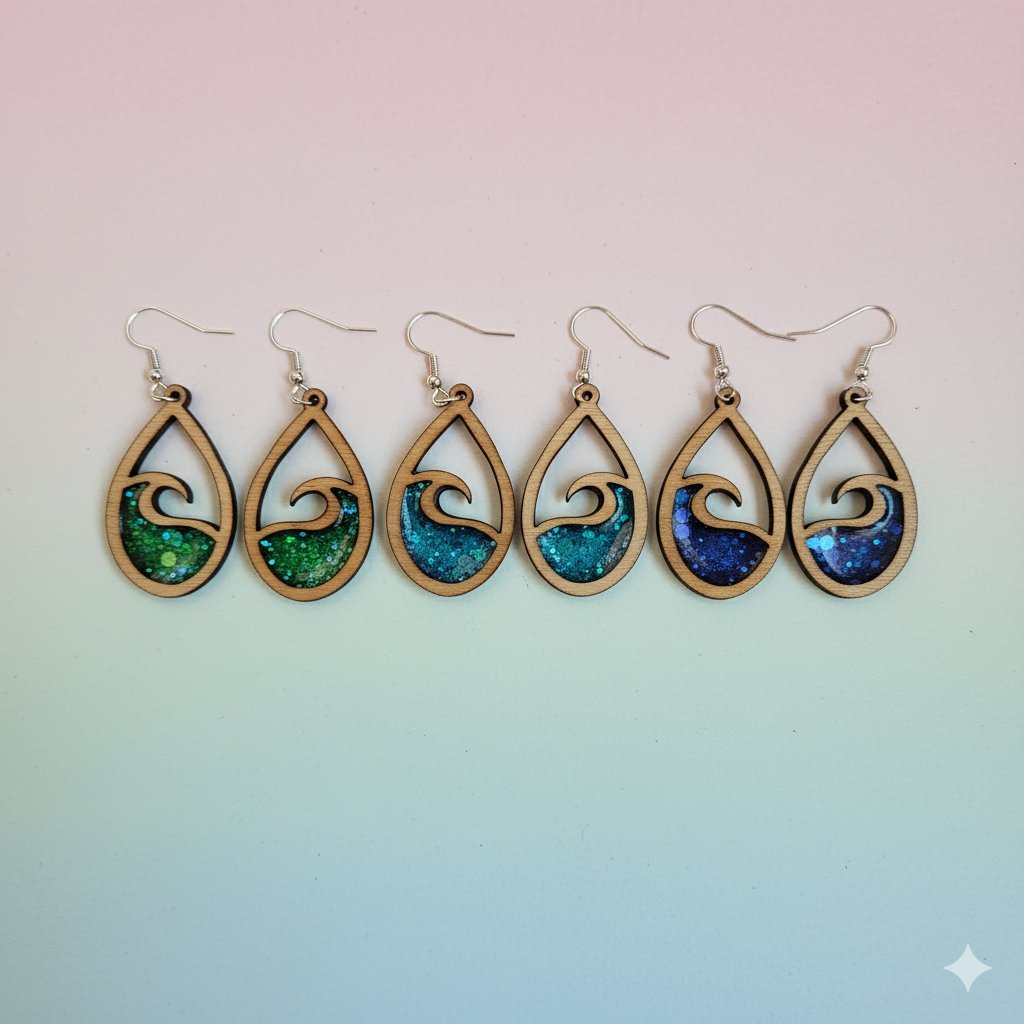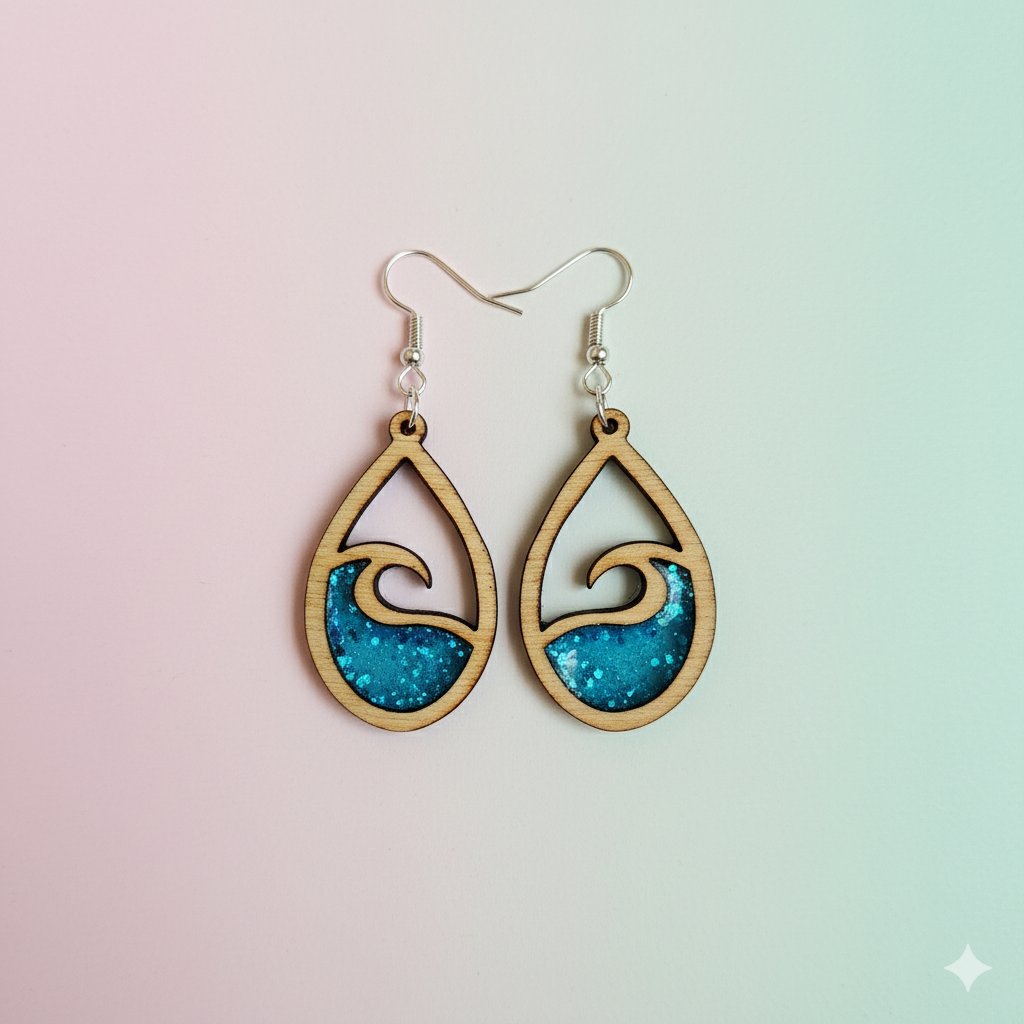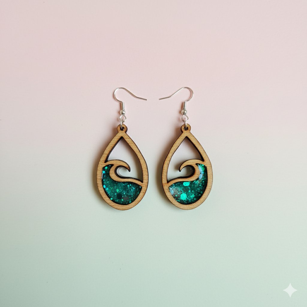 ¡Una joya que captura el movimiento y el color del Mediterráneo! Estos pendientes colgantes combinan la calidez de la madera natural con el brillo intenso de la resina epoxi, recreando la silueta de una ola rompiendo. Son el accesorio perfecto para amantes del mar y del estilo boho-chic.