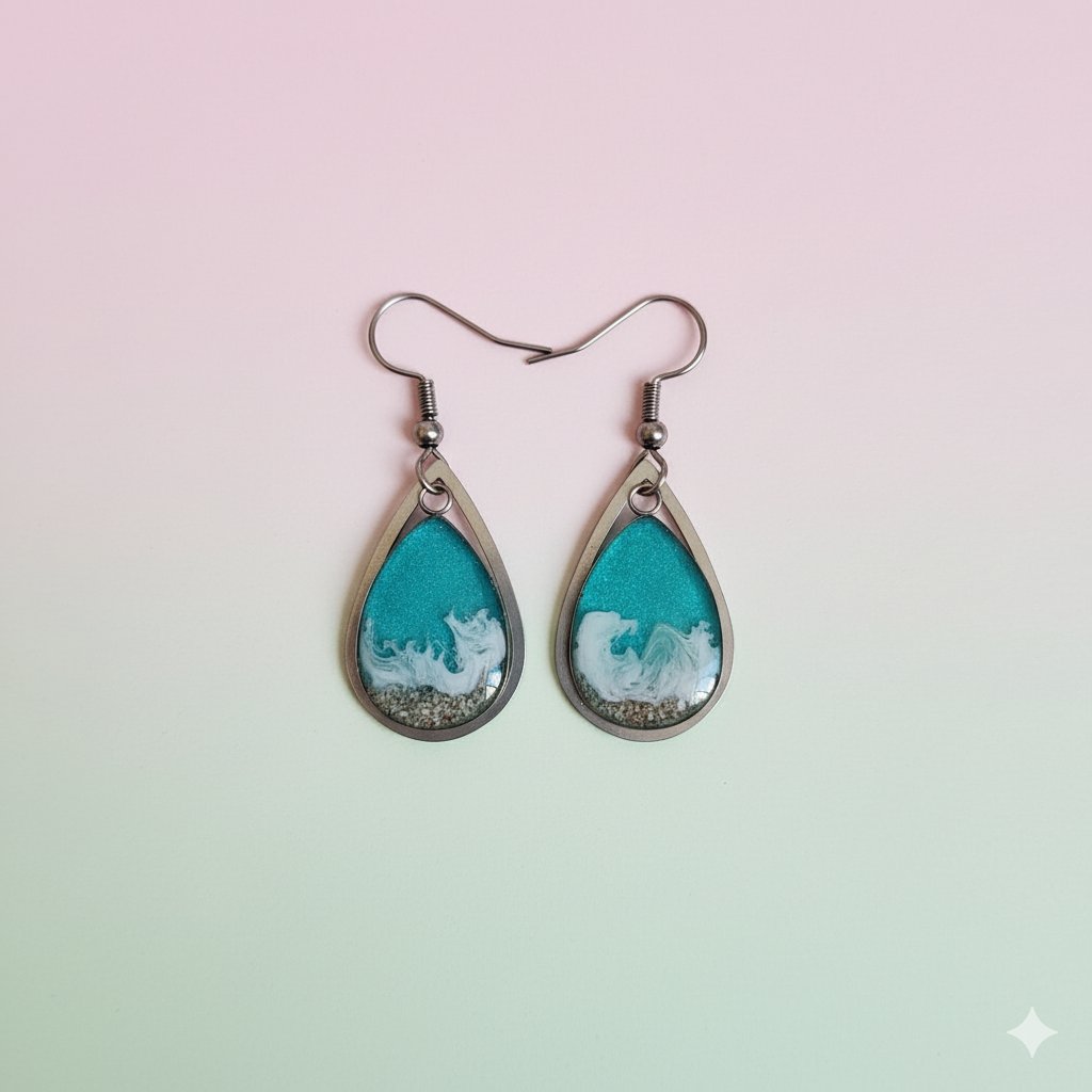 ¡Elegancia fluida inspirada en el Mediterráneo! Estos exquisitos pendientes colgantes capturan el vibrante paisaje costero en miniatura dentro de un marco de metal sofisticado. Son una pieza de joyería única y artesanal, ideal para quienes aman el estilo contemporáneo y el mar.