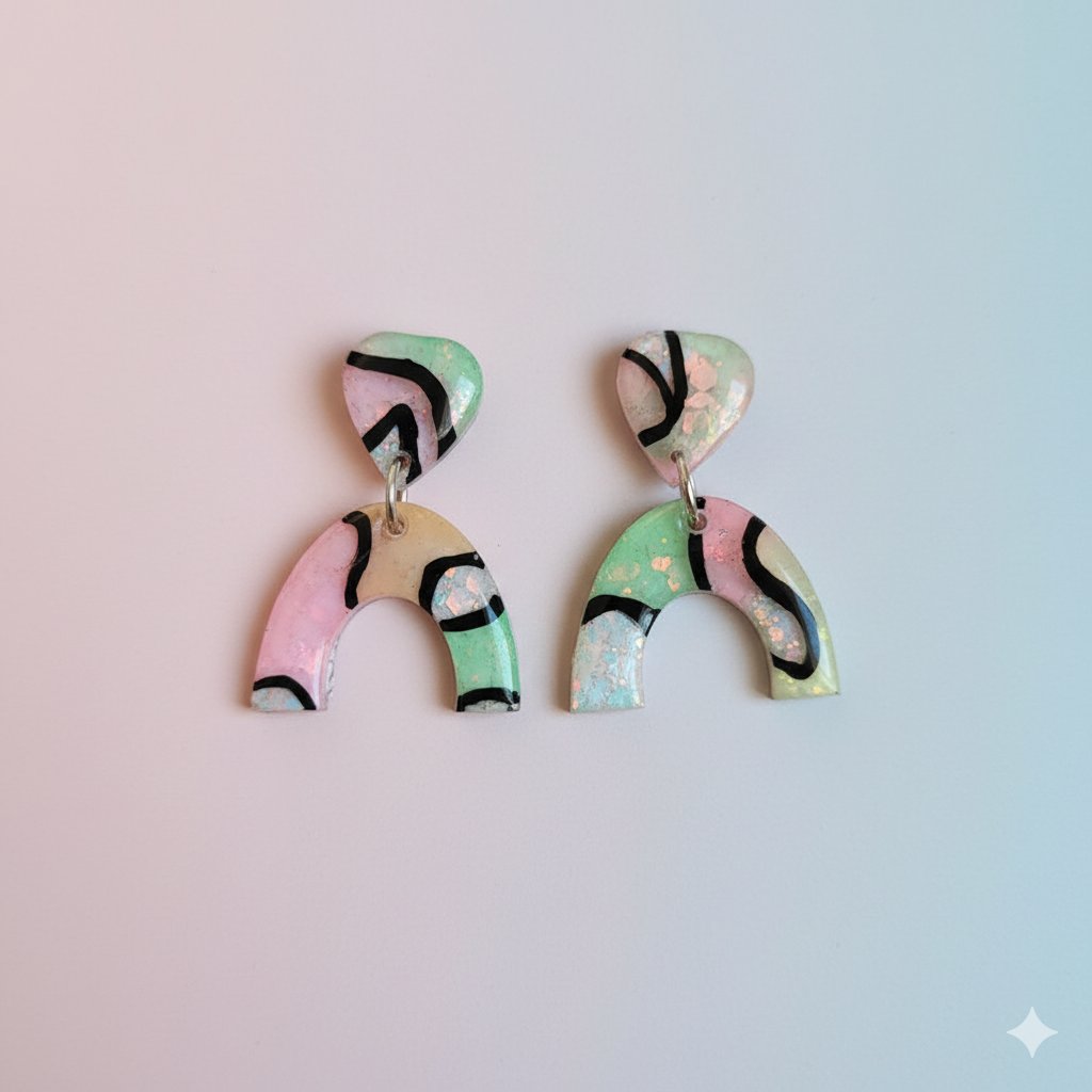 Estos pendientes de dos piezas están elaborados a mano con resina epoxi de la mejor calidad, lo que garantiza un acabado ultra-brillante y duradero. El diseño incluye: