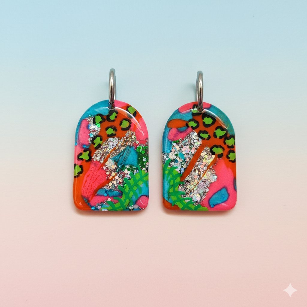 Estos pendientes con forma de arco o domo están elaborados a mano con resina epoxi de la mejor calidad, lo que garantiza un acabado ultra-brillante, liso y duradero. El diseño es una vibrante mezcla de: