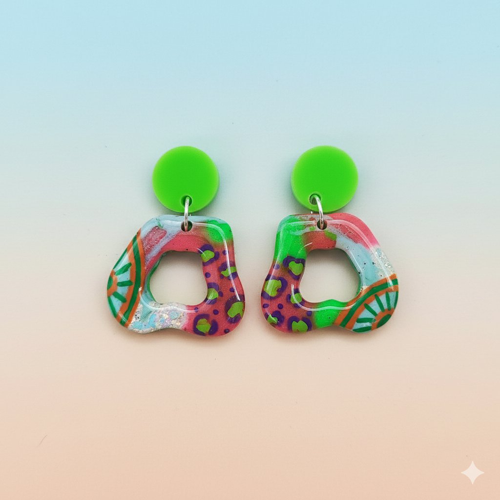 ¡Una explosión de color y alegría para tus orejas! Los pendientes colgantes "Maribel" son una pieza vibrante y funky que combina una base de neón con un diseño abstracto de patrones y brillos. Son el accesorio perfecto para inyectar una dosis de energía y originalidad a tu look.