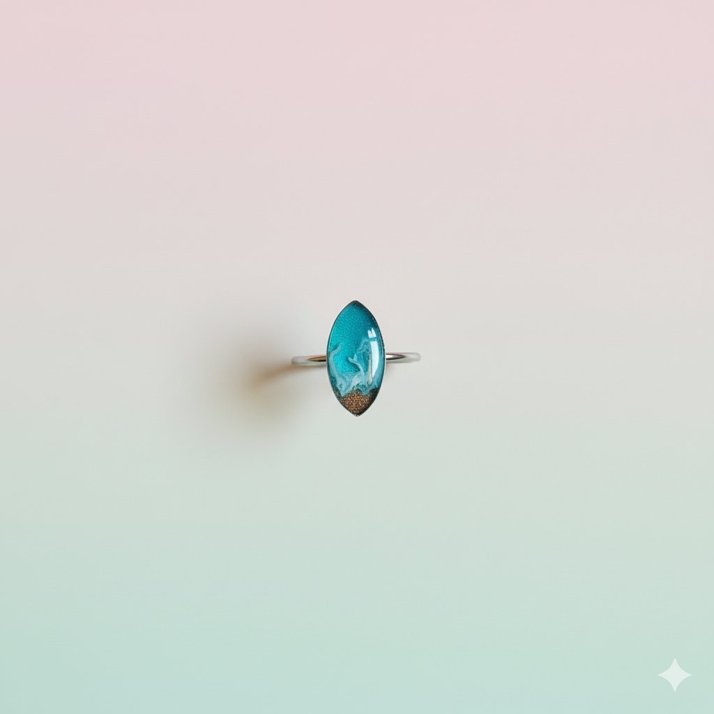 ¡Lleva un pequeño mar encapsulado en un diseño elegante! Este anillo statement combina la sofisticación de la forma marquesa con la belleza viva de la costa balear. Es una joya única y artesanal, perfecta para amantes de la playa, la naturaleza y el diseño moderno.