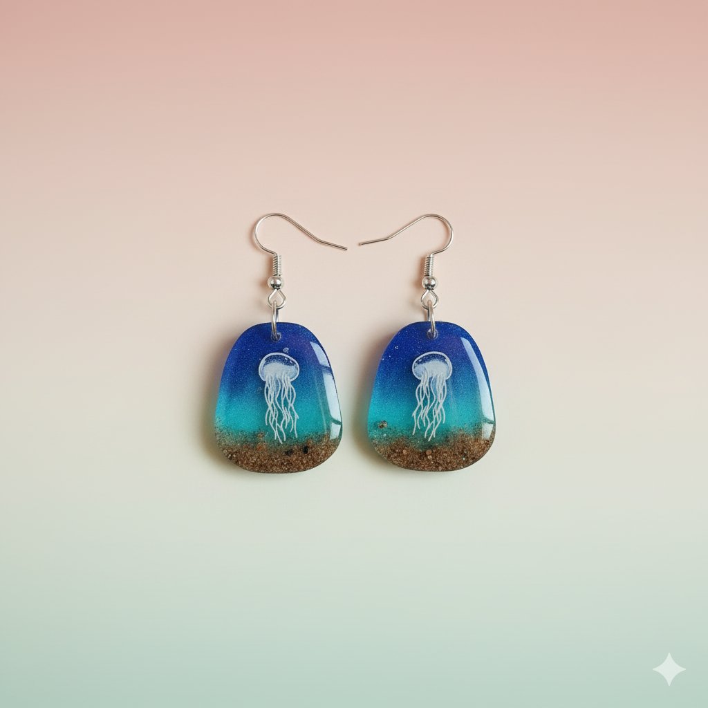 ¡Captura la belleza y el misterio de las profundidades! Estos pendientes colgantes son una pieza de joyería única y artesanal que recrea un hipnótico paisaje submarino con una medusa. Perfectos para amantes del mar, la fantasía y los diseños con significado.