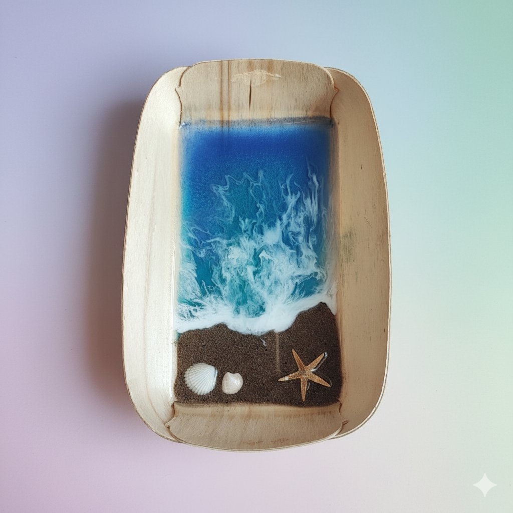 ¡La naturaleza se une al arte funcional! Esta espectacular bandeja/joyero combina la calidez de la madera natural con un vívido paisaje de la costa balear encapsulado. Es una pieza de decoración única y artesanal, perfecta para organizar tus objetos de valor o añadir un toque boho a tu hogar.