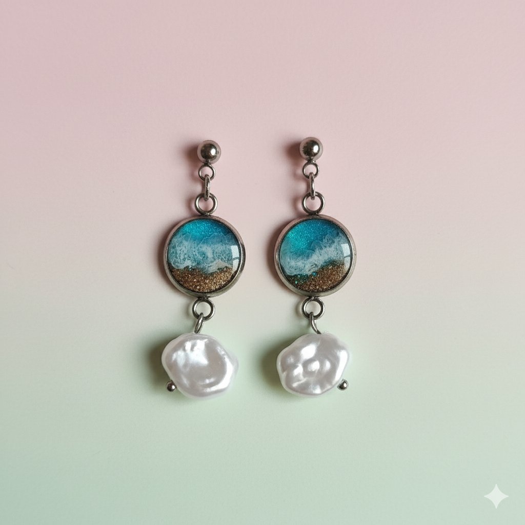 ¡Elegancia clásica inspirada en el mar Mediterráneo! Estos exquisitos pendientes largos combinan el realismo de un paisaje de playa con la sofisticación atemporal de las perlas. Son una pieza de joyería única y artesanal, perfecta para elevar cualquier look con un toque de lujo natural.