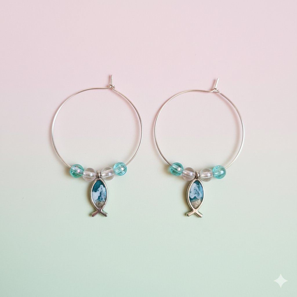 ¡Captura la esencia del mar en un diseño chic y divertido! Estos pendientes de aro combinan la elegancia de los aros grandes con un delicado colgante de pez que encapsula un paisaje costero. Son una pieza de joyería única y artesanal, perfecta para inyectar un toque náutico y mediterráneo a tu estilo.