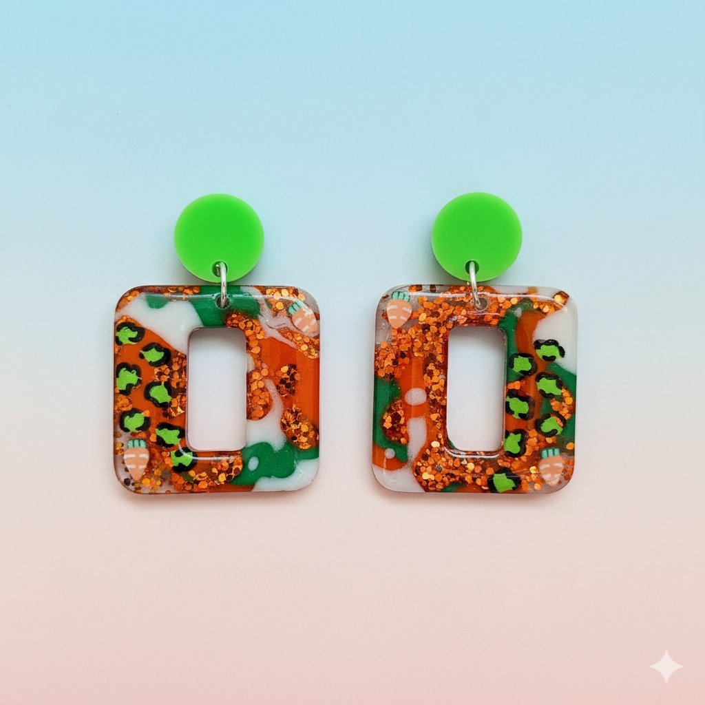 Estos pendientes rectangulares huecos están elaborados a mano con resina epoxi de la mejor calidad, garantizando un acabado ultra-brillante y liso. El diseño incluye: