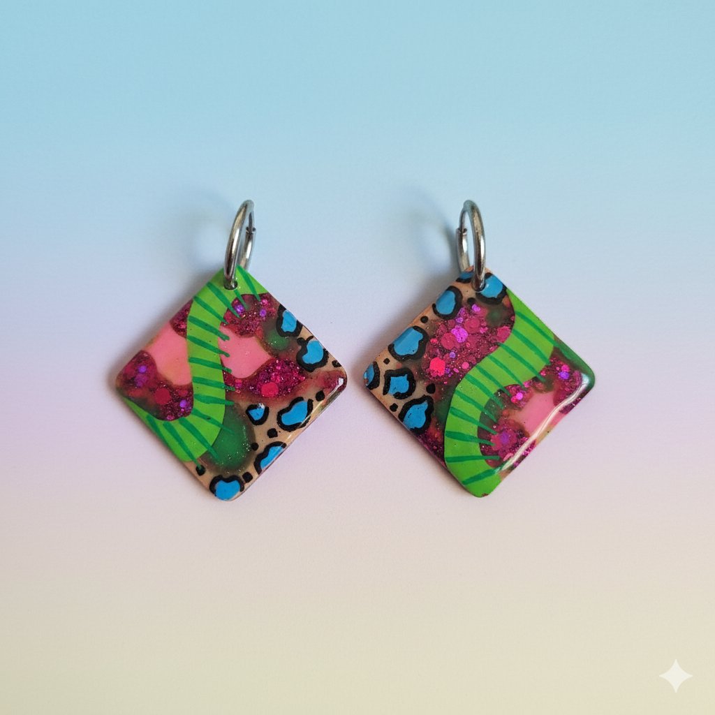 Estos pendientes cuadrados/romboidales huecos están elaborados a mano con resina epoxi de la mejor calidad, lo que garantiza un acabado ultra-brillante y duradero. El diseño es una mezcla audaz de: