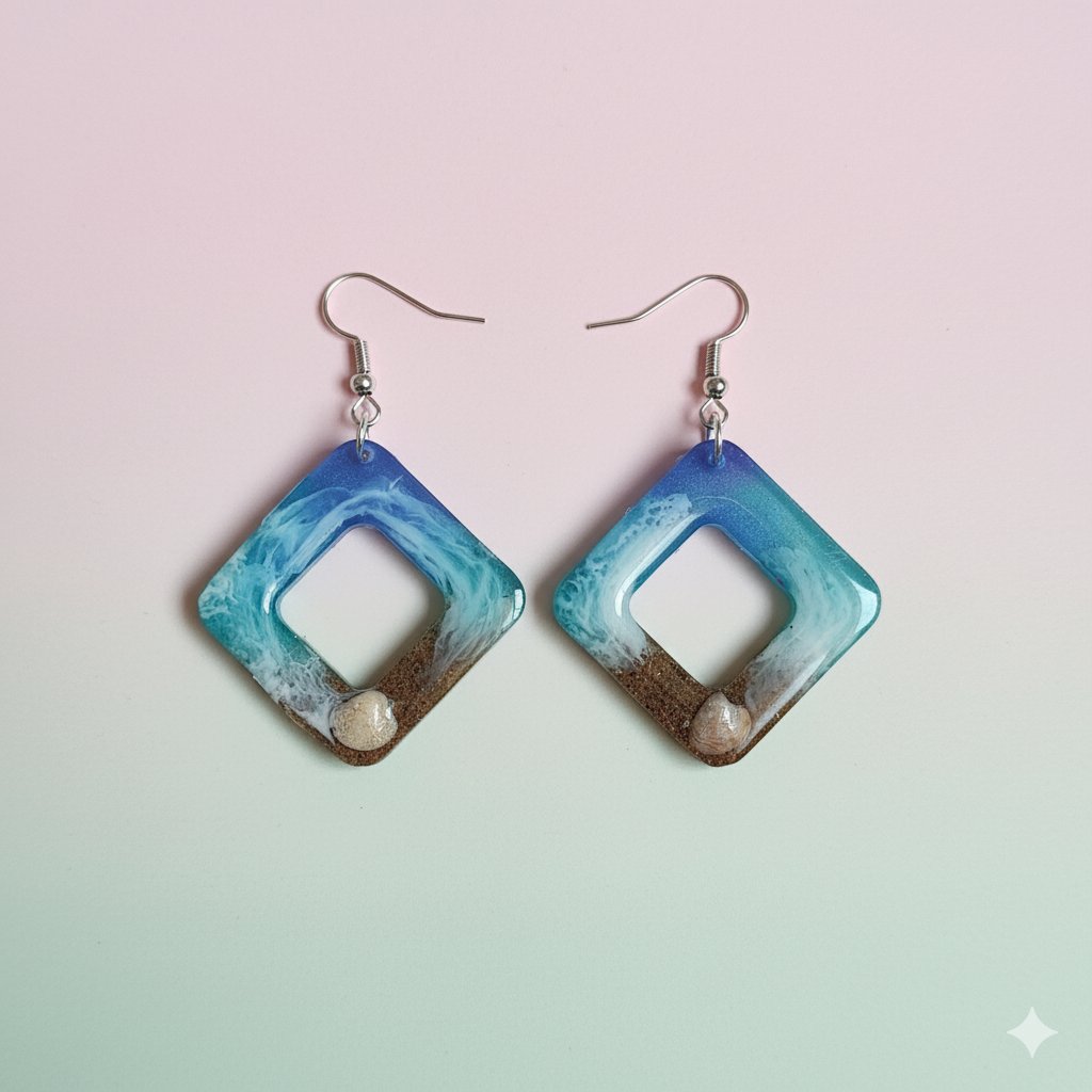¡Fusión de arte geométrico y naturaleza! Estos impresionantes pendientes statement capturan la belleza de la costa de Mallorca en una forma moderna y audaz de rombo hueco. Son una pieza de joyería única y artesanal, ideal para quienes aman el diseño contemporáneo y el mar.