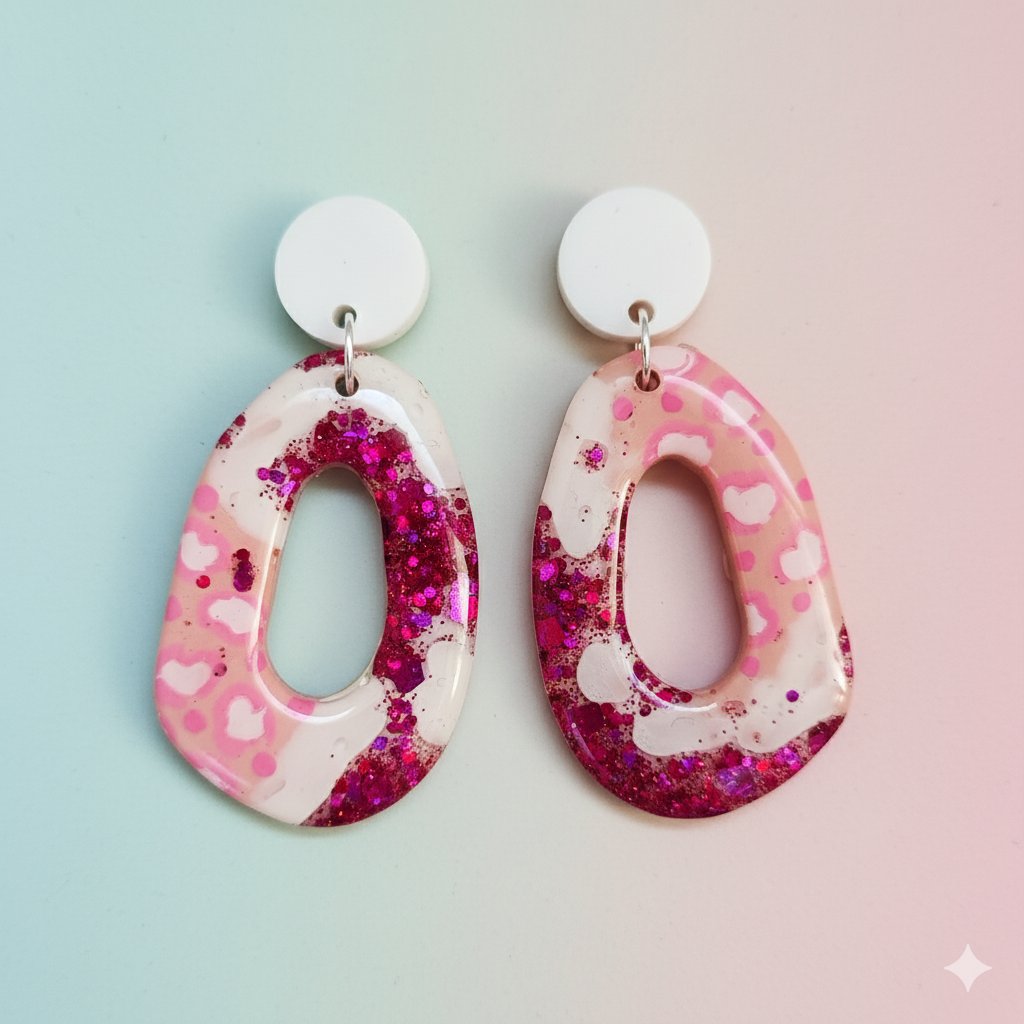 Estos pendientes con forma ovalada/orgánica están elaborados a mano con resina epoxi de la mejor calidad, lo que garantiza un acabado ultra-brillante, liso y de alta durabilidad. El diseño incluye: