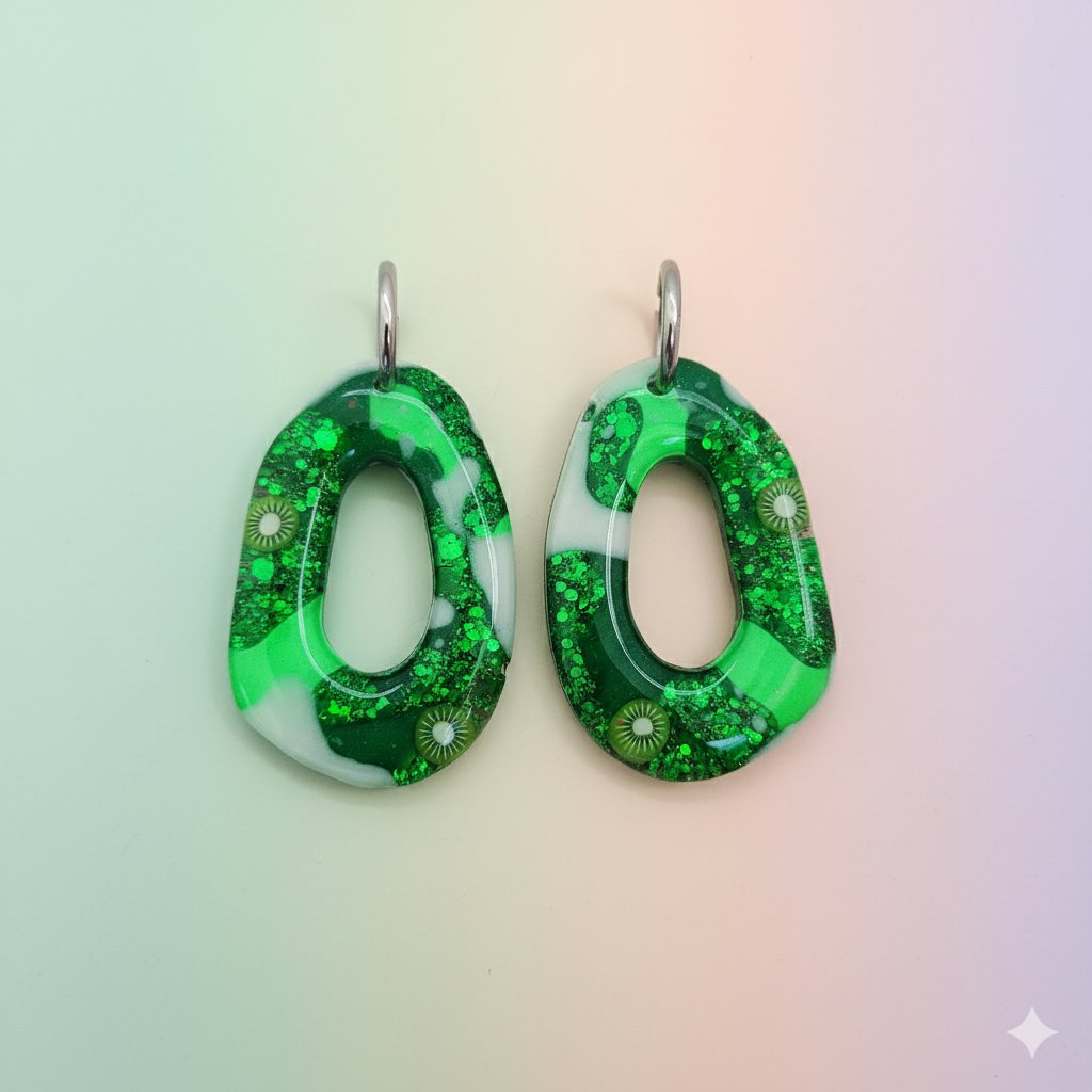 Estos pendientes con forma orgánica y hueca (ovalada irregular) están elaborados a mano con resina epoxi de la mejor calidad, lo que garantiza un acabado ultra-brillante, liso y duradero. El diseño temático incluye:
