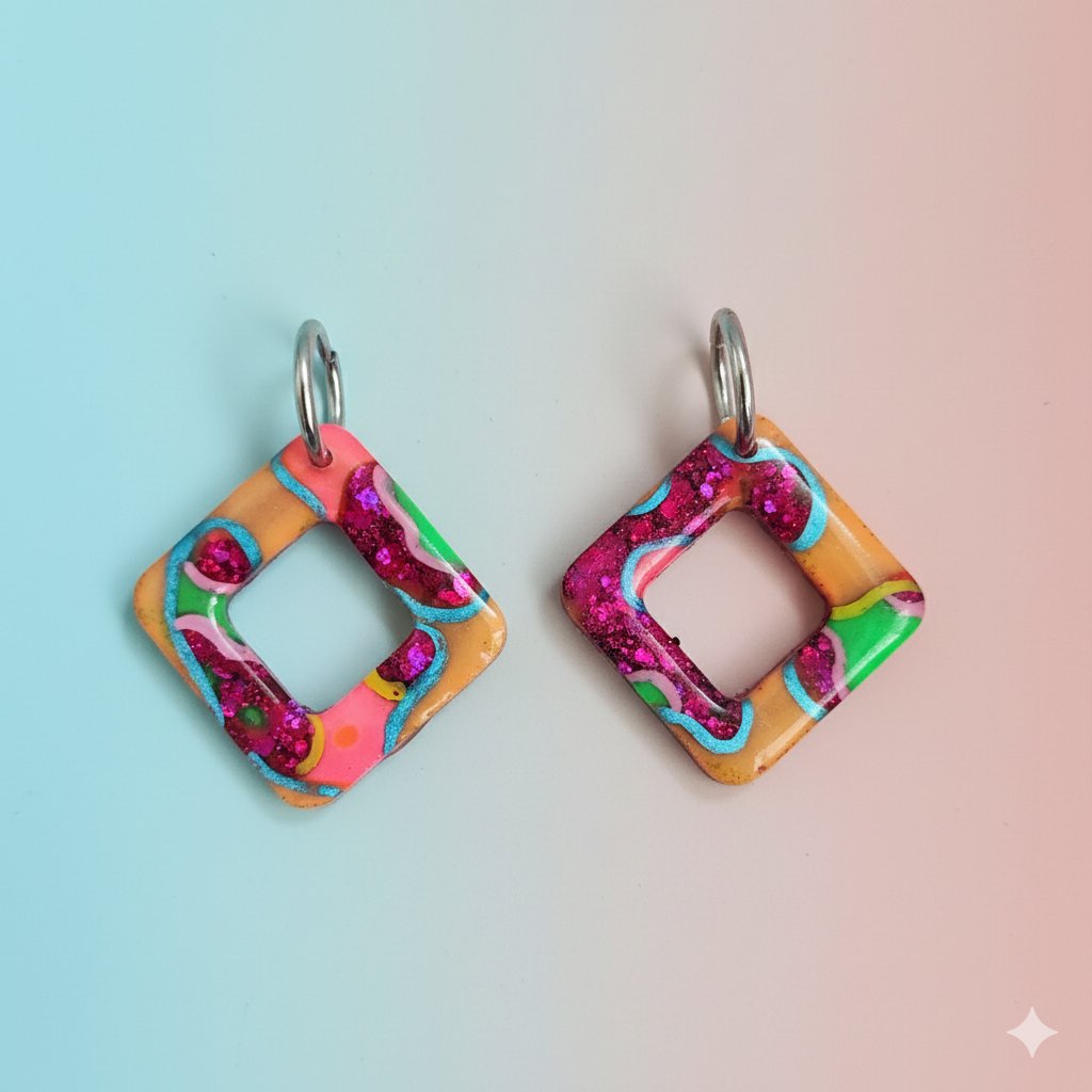 Estos pendientes con forma de rombo hueco están elaborados a mano con resina epoxi de la mejor calidad, lo que garantiza un acabado ultra-brillante y duradero. El diseño es una explosión groovy de: