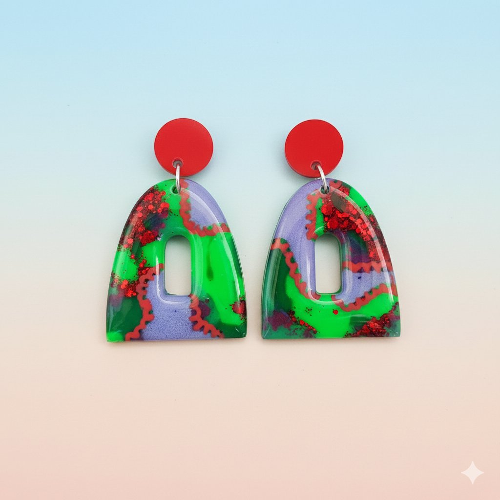 Estos pendientes de dos piezas están elaborados a mano con resina epoxi de la mejor calidad, garantizando un acabado ultra-brillante, liso y duradero. El diseño incluye:
