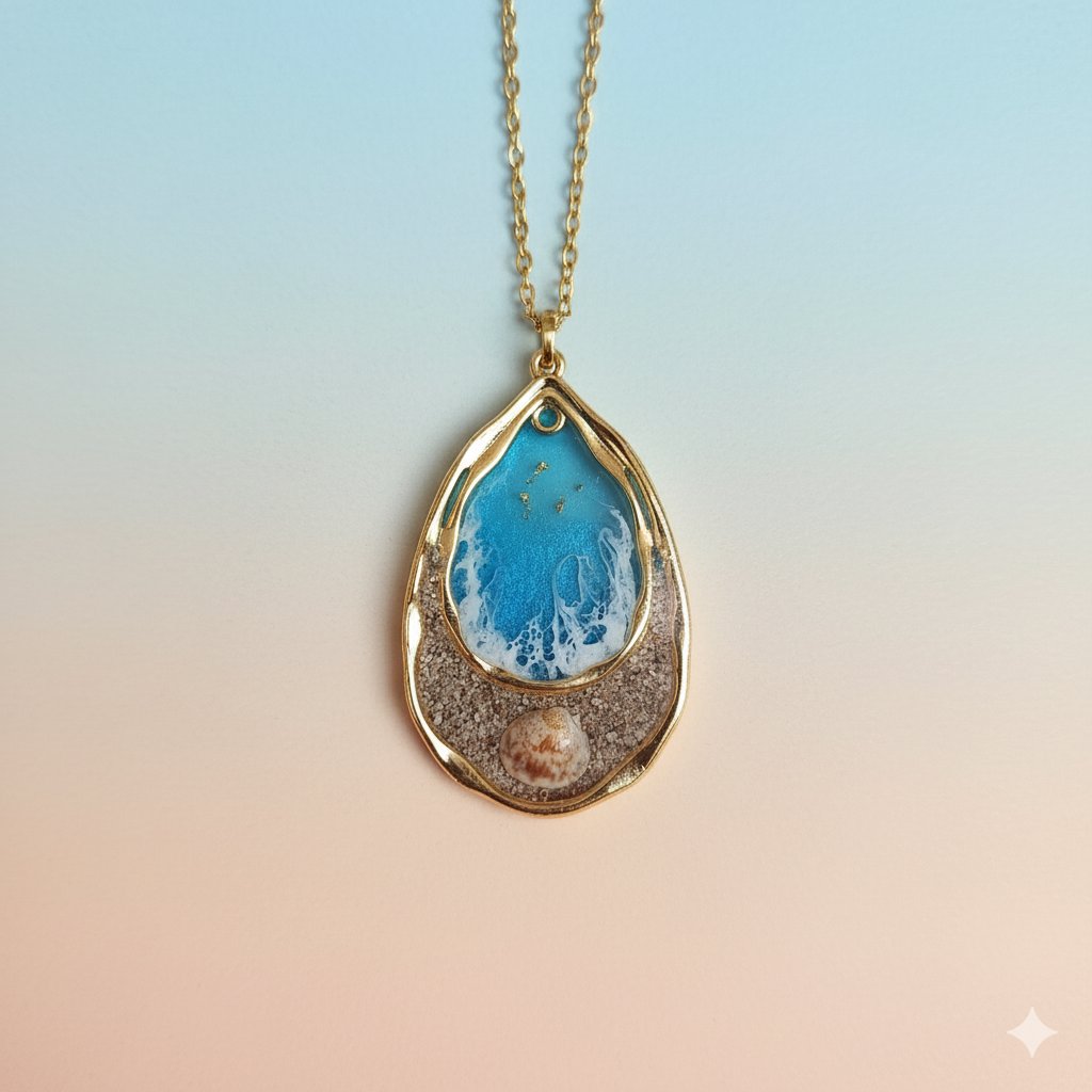 ¡El lujo del oro se encuentra con el mar! Este impresionante collar presenta un colgante de lágrima enmarcado en metal dorado, encapsulando un vibrante paisaje de la costa mediterránea. Es una pieza de joyería única y artesanal, perfecta para quienes buscan un accesorio elegante y con un profundo significado personal.