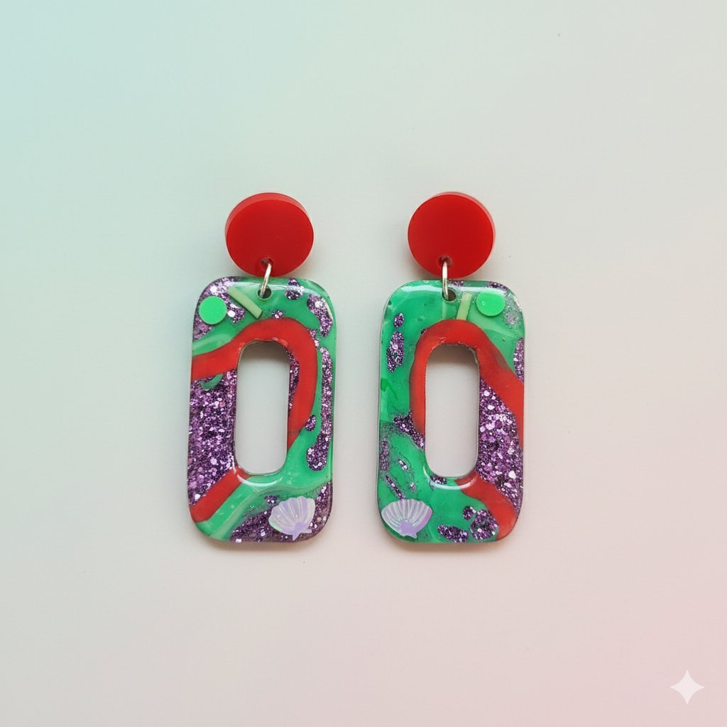 ¡Sumérgete en el color! Los pendientes "Yolanda" son una pieza de declaración que fusiona una forma geométrica audaz con una explosión de color y un toque de fantasía marina. Son el accesorio perfecto para un look funky y tropical.