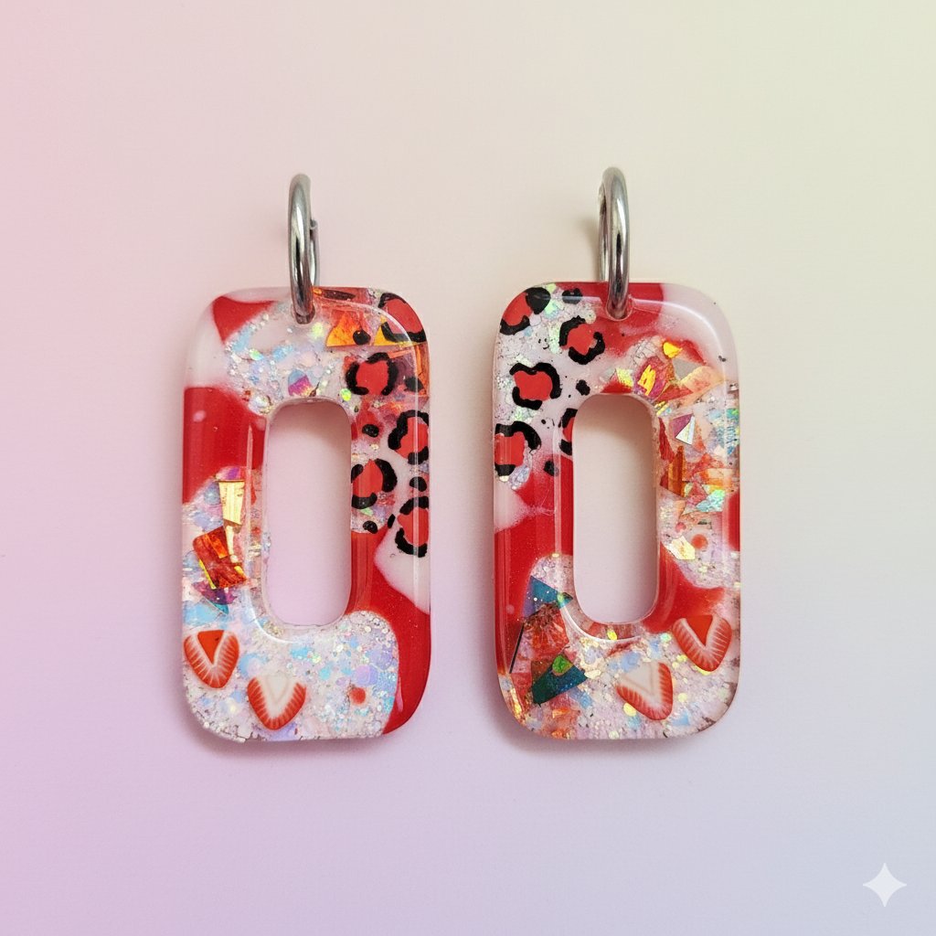 Estos pendientes rectangulares huecos están elaborados a mano con resina epoxi de la mejor calidad, garantizando un acabado ultra-brillante, liso y duradero. El diseño es una mezcla audaz de: